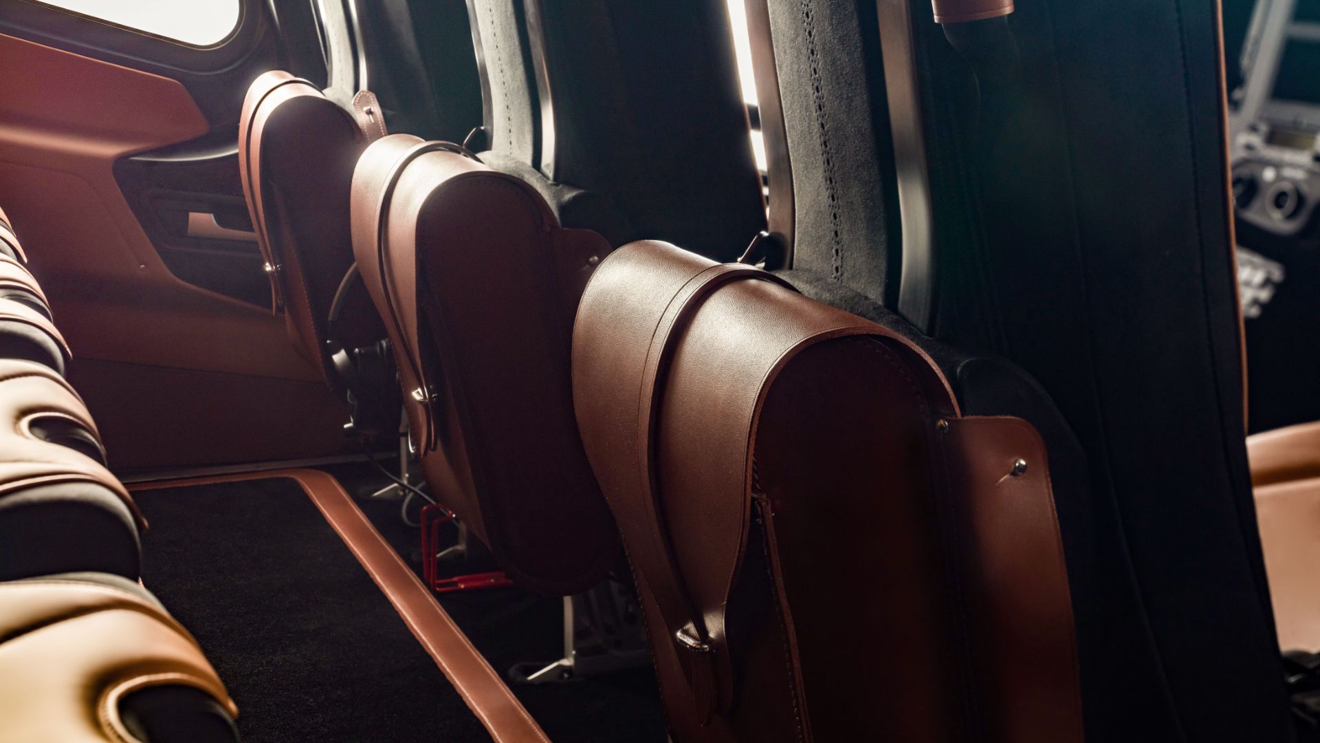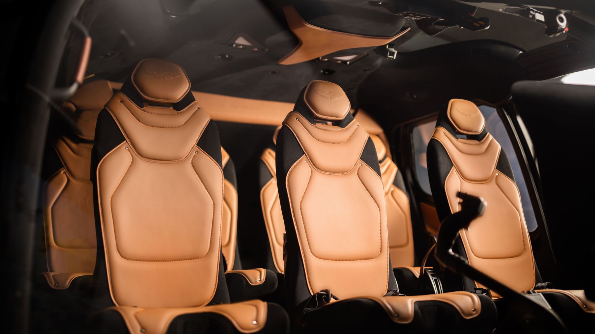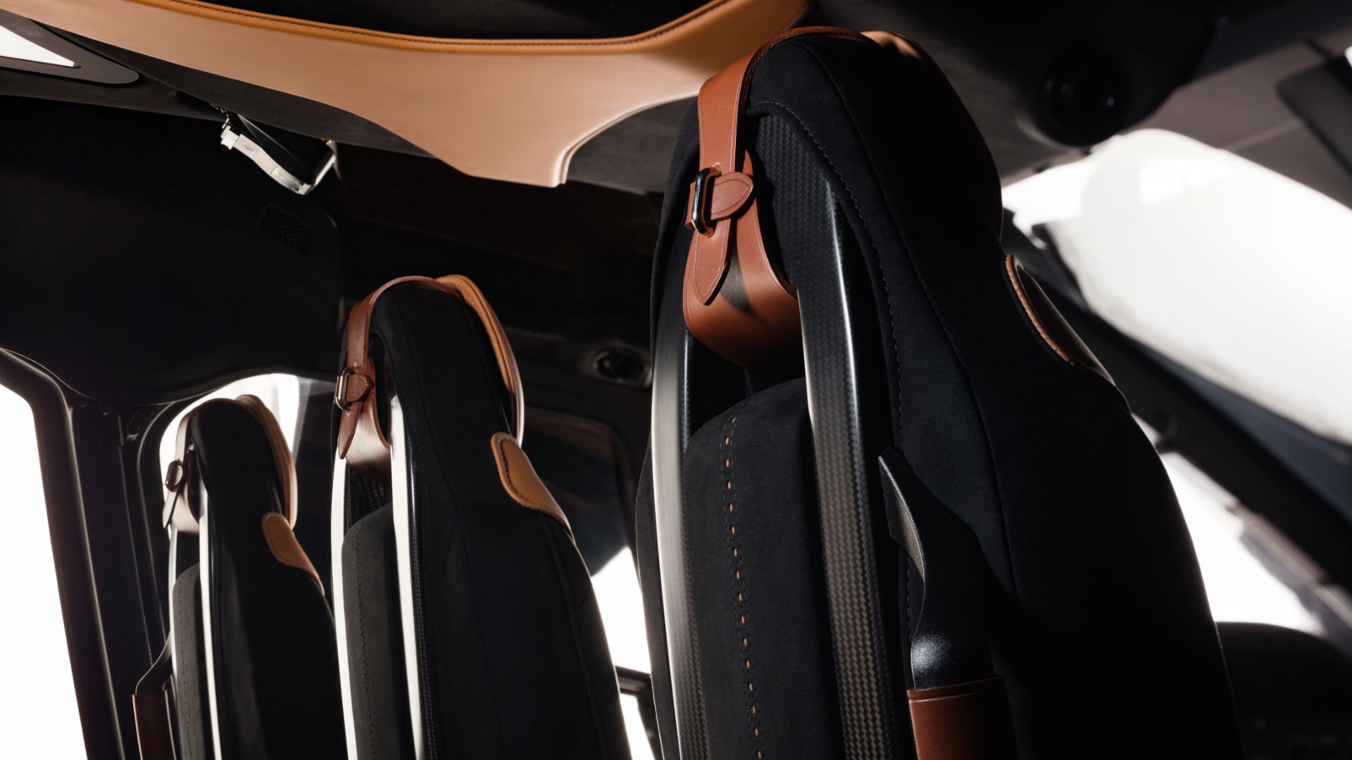 On the inside, Aston’s influence is obvious. Beautifully-appointed Oxford tan leather seating comes with the Aston wings embossed on the headrests. Matching bags and Alcantara highlights throughout the cabin complete the look. Jumping from your DBS Superleggera to your ACH130, you’ll feel right at home. Other cabin colours include Pure Black, Cormorant and Ivory.