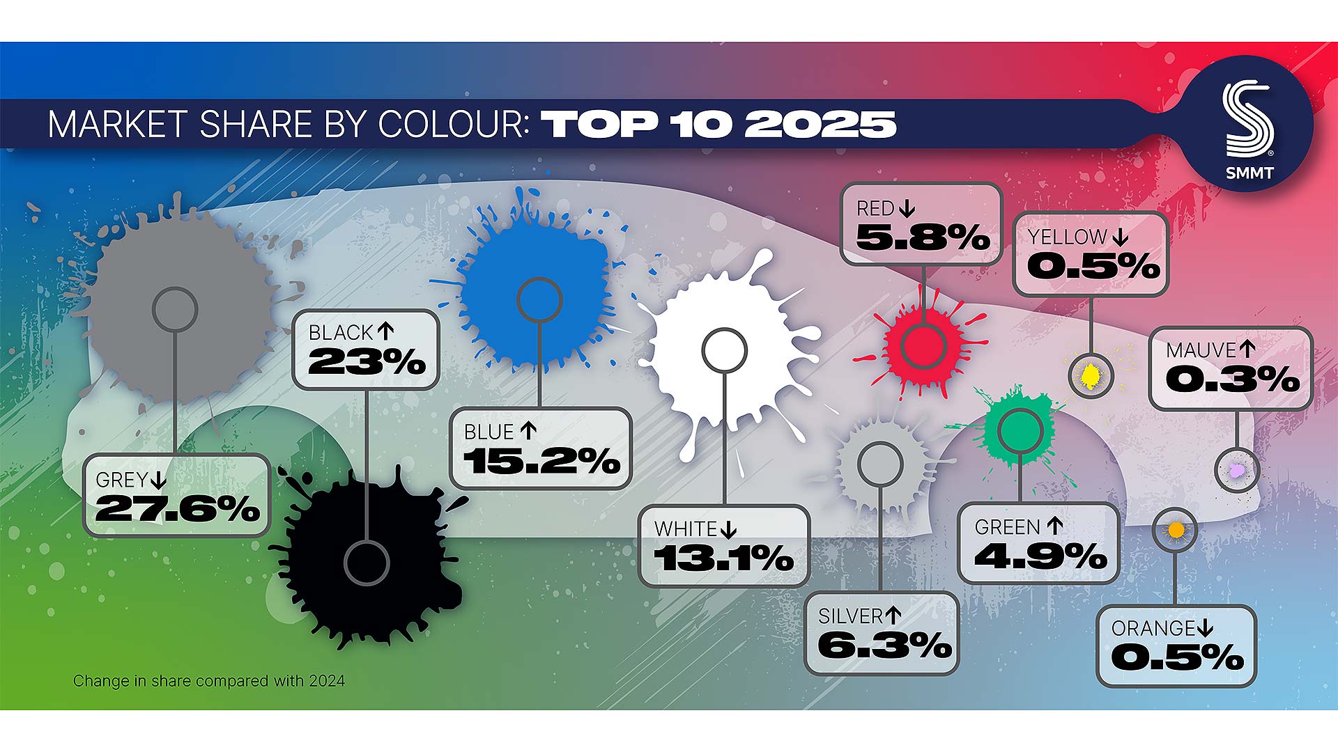 “UK car buyers’ preferences remain pretty consistent, with monochrome continuing to lead in popularity,” said SMMT chief executive Mike Hawes.