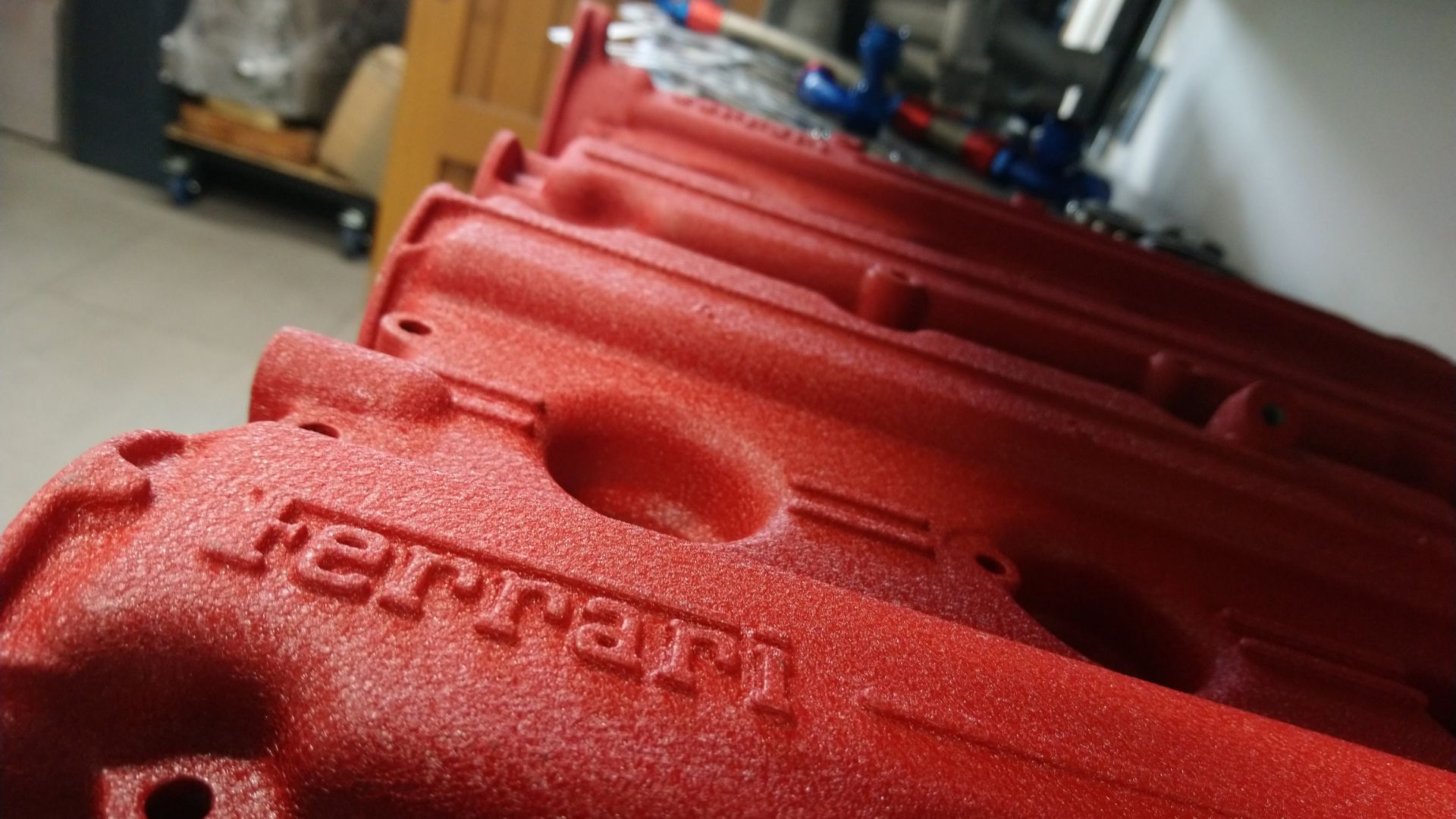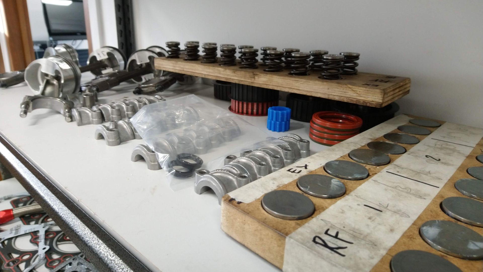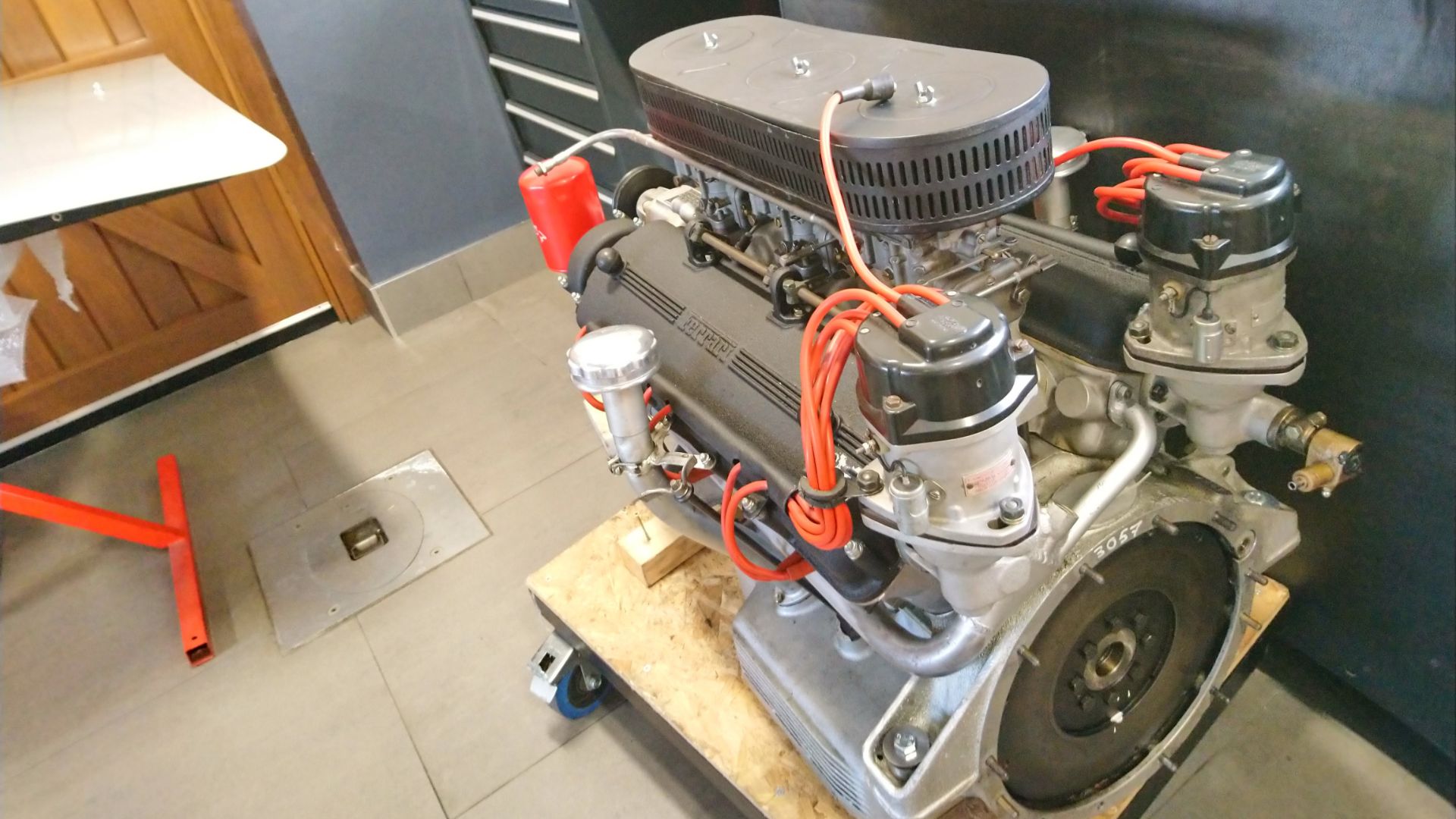 A Ferrari Challenge engine is sat on the side, an Aston Martin straight-six on a stand, and another Ferrari engine on a palette. On a cabinet, valves, valve springs pistons (numbered) and the kind of distinctive cam covers that could only belong to a Ferrari.