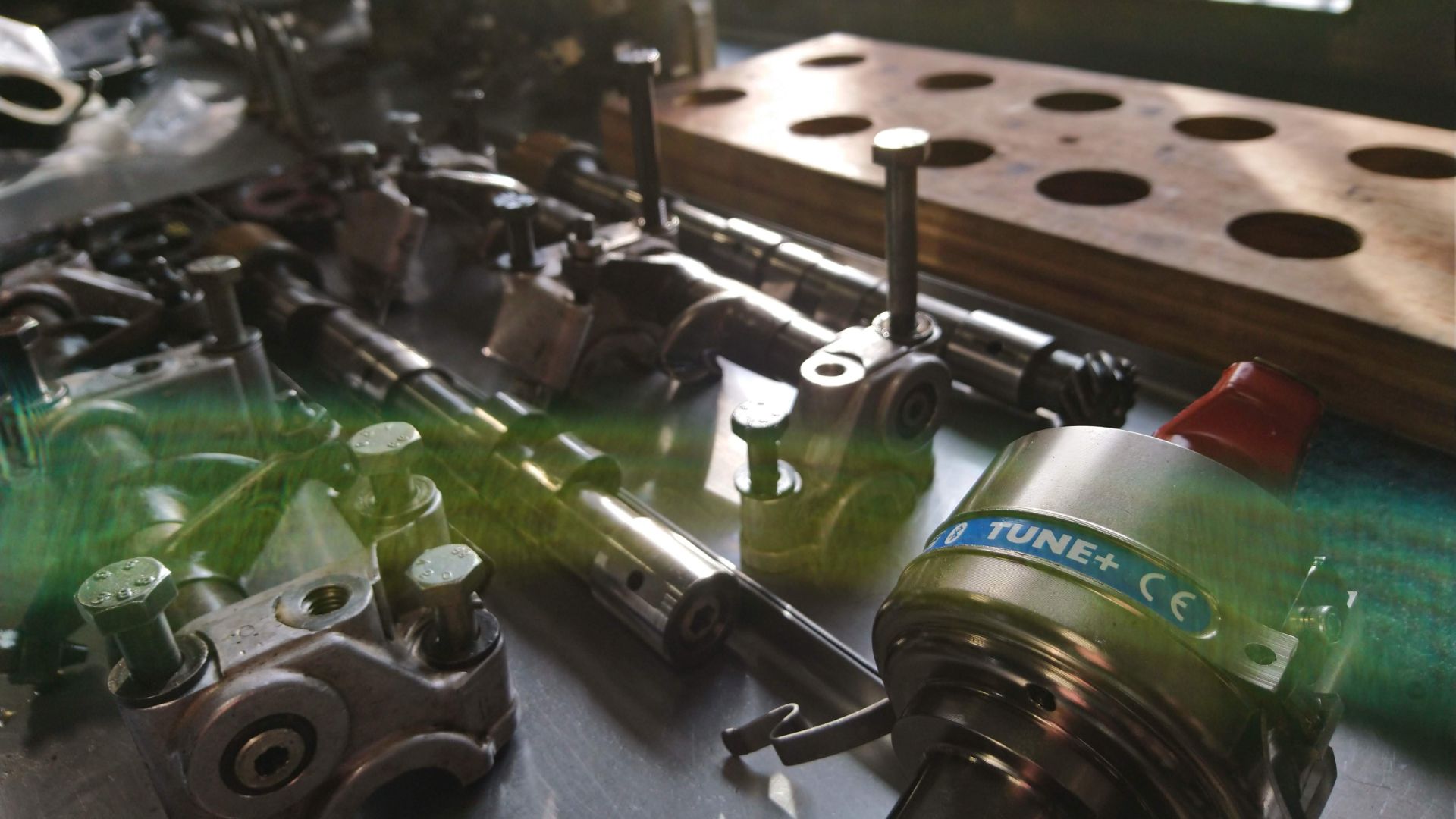 Intricate engine innards lay across a workbench – the inlet trumpets, manifolds, studs and cam gears from a race-spec Lancia Fulvia.
