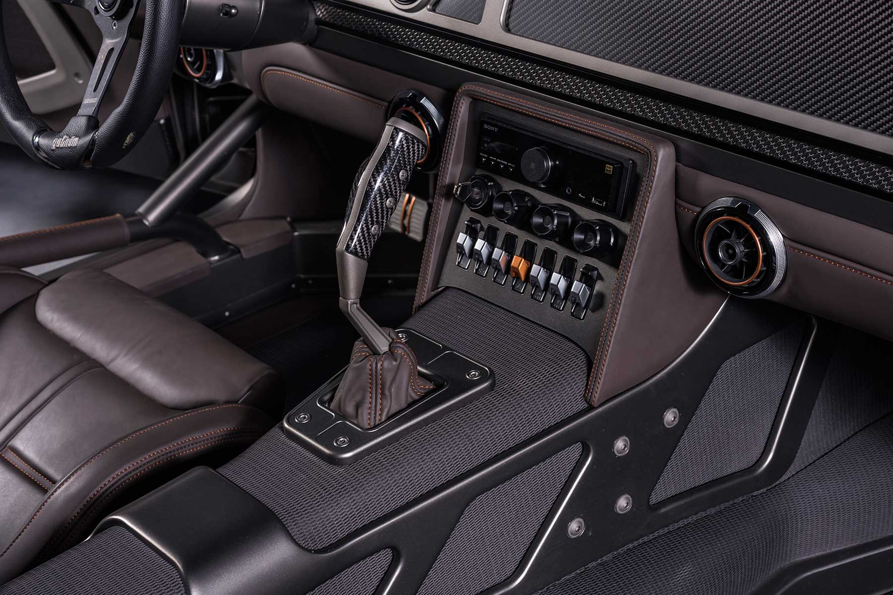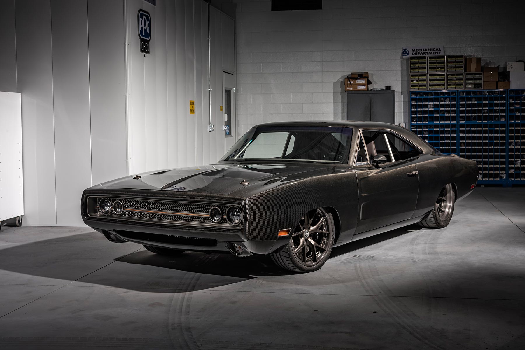 SpeedKore also produced a custom 14-point roll cage, mounting fuel and oil lines hidden inside to keep the carbon and leather clad interior neat. Even the classic Charger pistol-grip shifter gets a carbon makeover, connected to a Tremec six-speed gearbox.