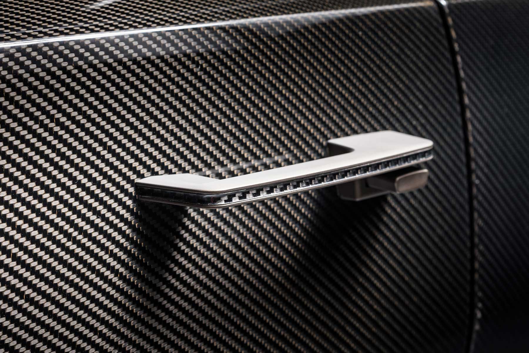 All the carbon fibre panels are left with a polished clear coat, allowing the natural weave to be seen. The billet aluminium pieces, including the exquisitely detailed door handles, have a bronze-nickel coating to make them stand out.