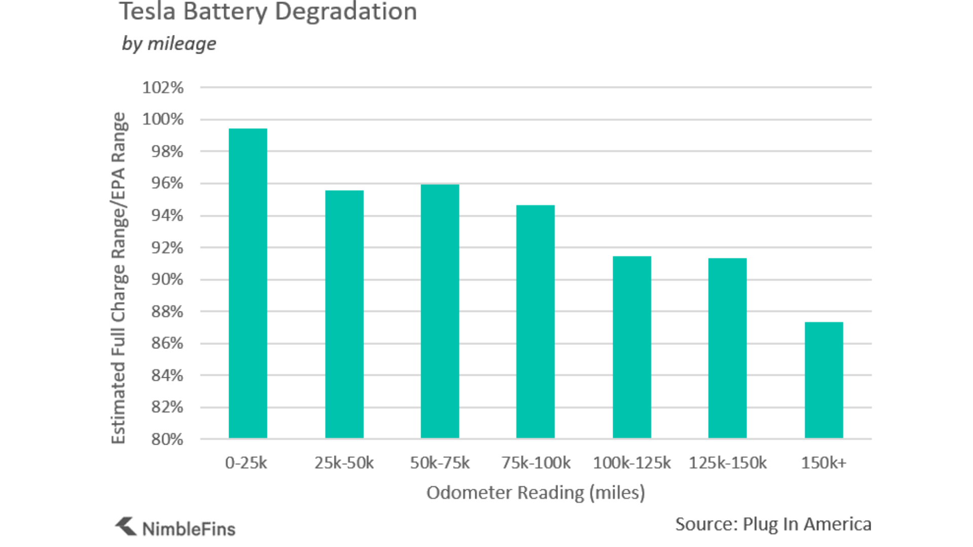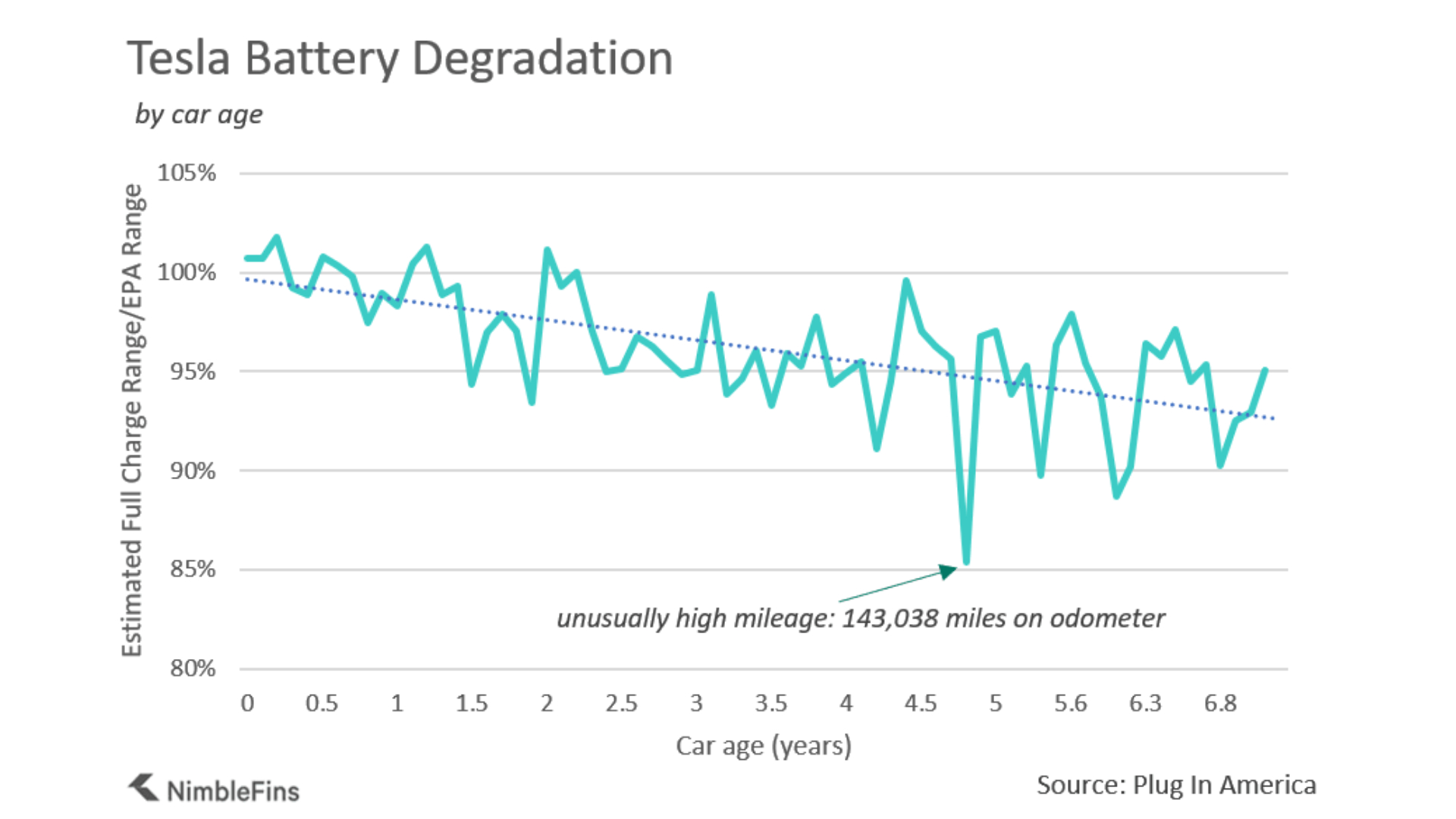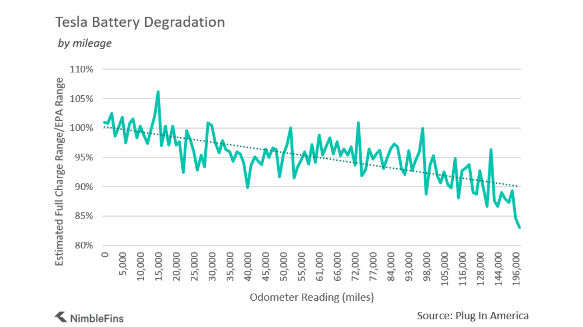 The Tesla research was carried out by Plug In America and analysed by NimbleFins. Five hundred Tesla Model S owners submitted data on the usage of their cars. These included when it was manufactured, bought, the battery size, the quoted range (when new) and the mileage the car has covered.