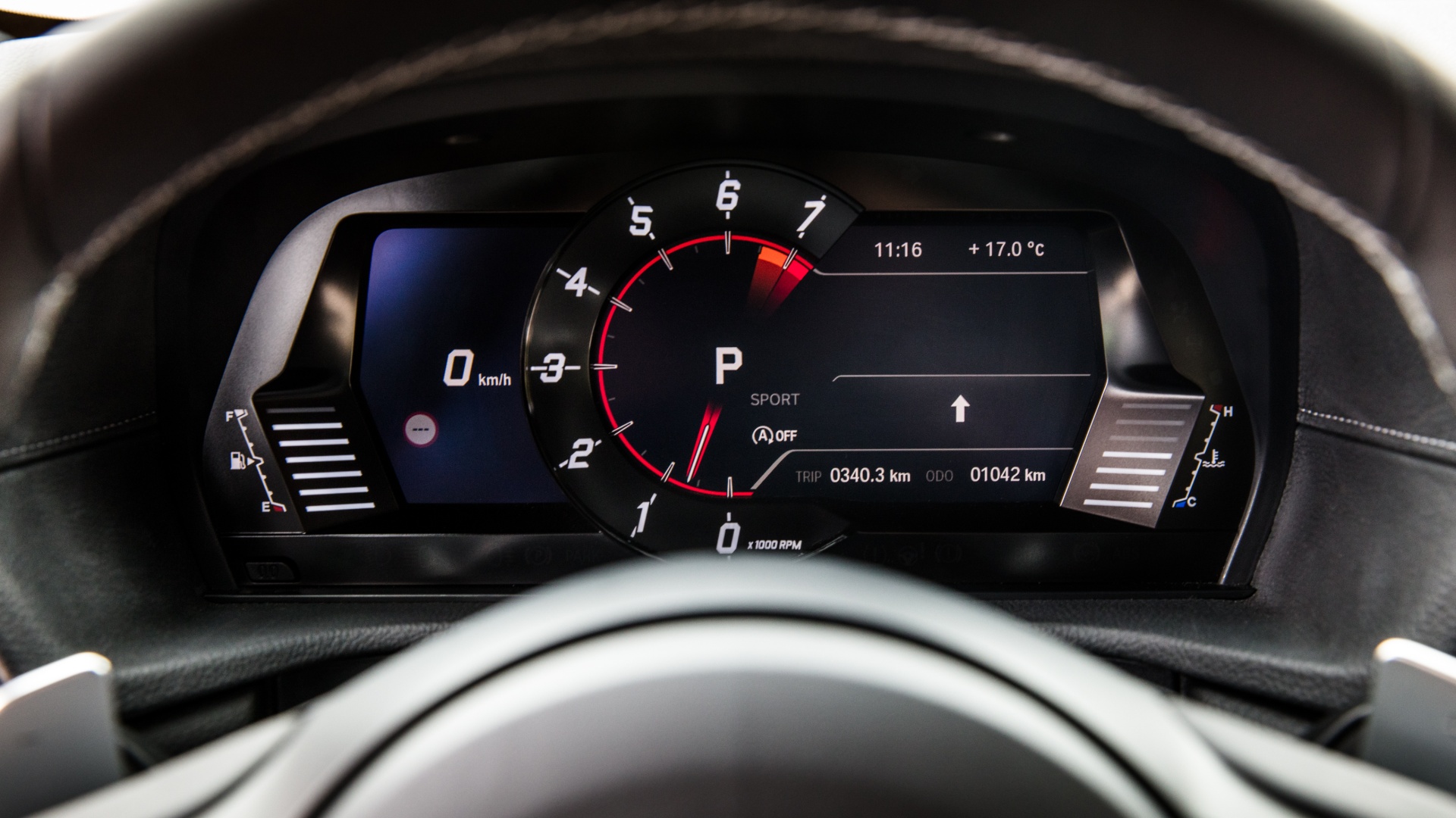 You sit low, in ‘racing-inspired’ seats, cocooned by the domed roof and tall transmission tunnel. The dashboard is nigh-on identical to a Z4, from the gear selector to the iDrive media system. Only an 8.8-inch digital instrument display is unique to the Supra, its 3D-look rev counter positioned front-and-centre. Apple Carplay connectivity is standard, but there’s no Android Auto for now.
