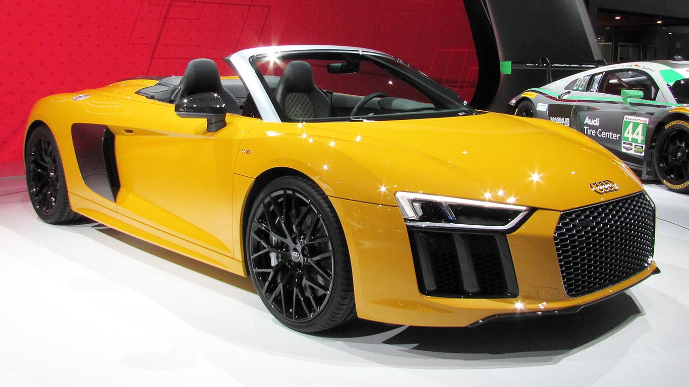 The new R8 Spyder is on full display on Audi’s New York stand, sitting alongside an R8 coupe and a racing R8 sportscar.